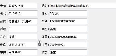 车品牌,车型,颜色,出厂日期,所有人名字,登记住所,联系电话,国产/进口。